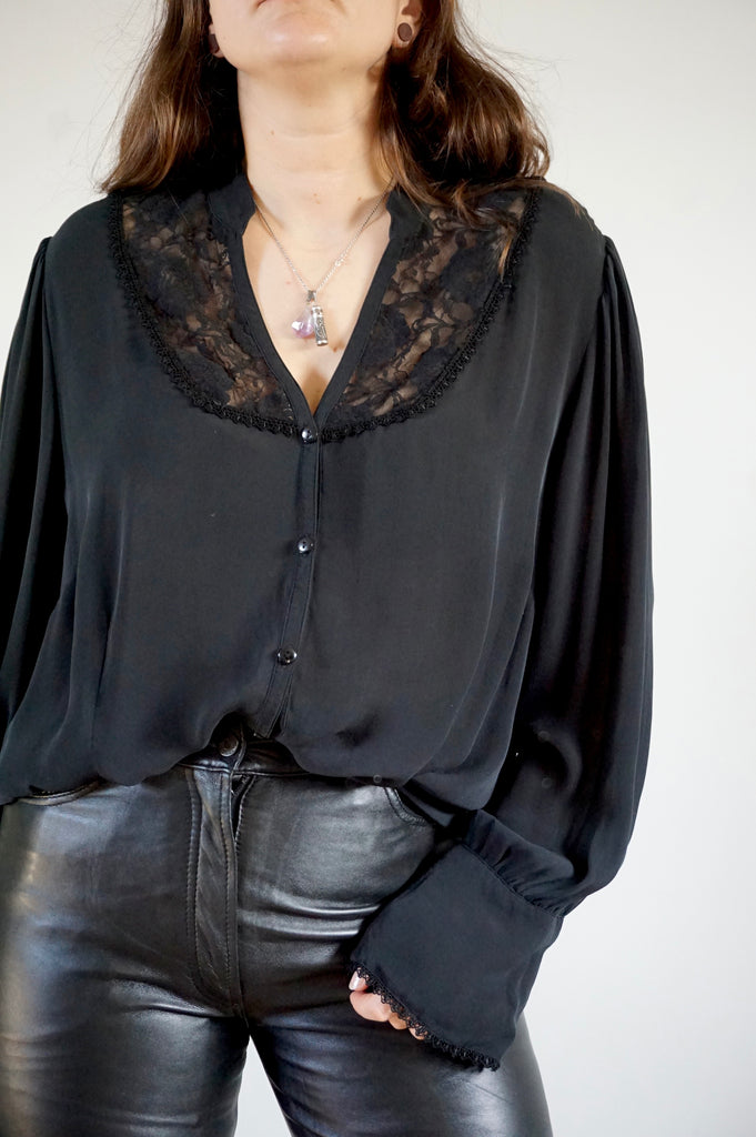 The Nightwatch - Vintage Blouse - 100% Silk - Lace Details - L