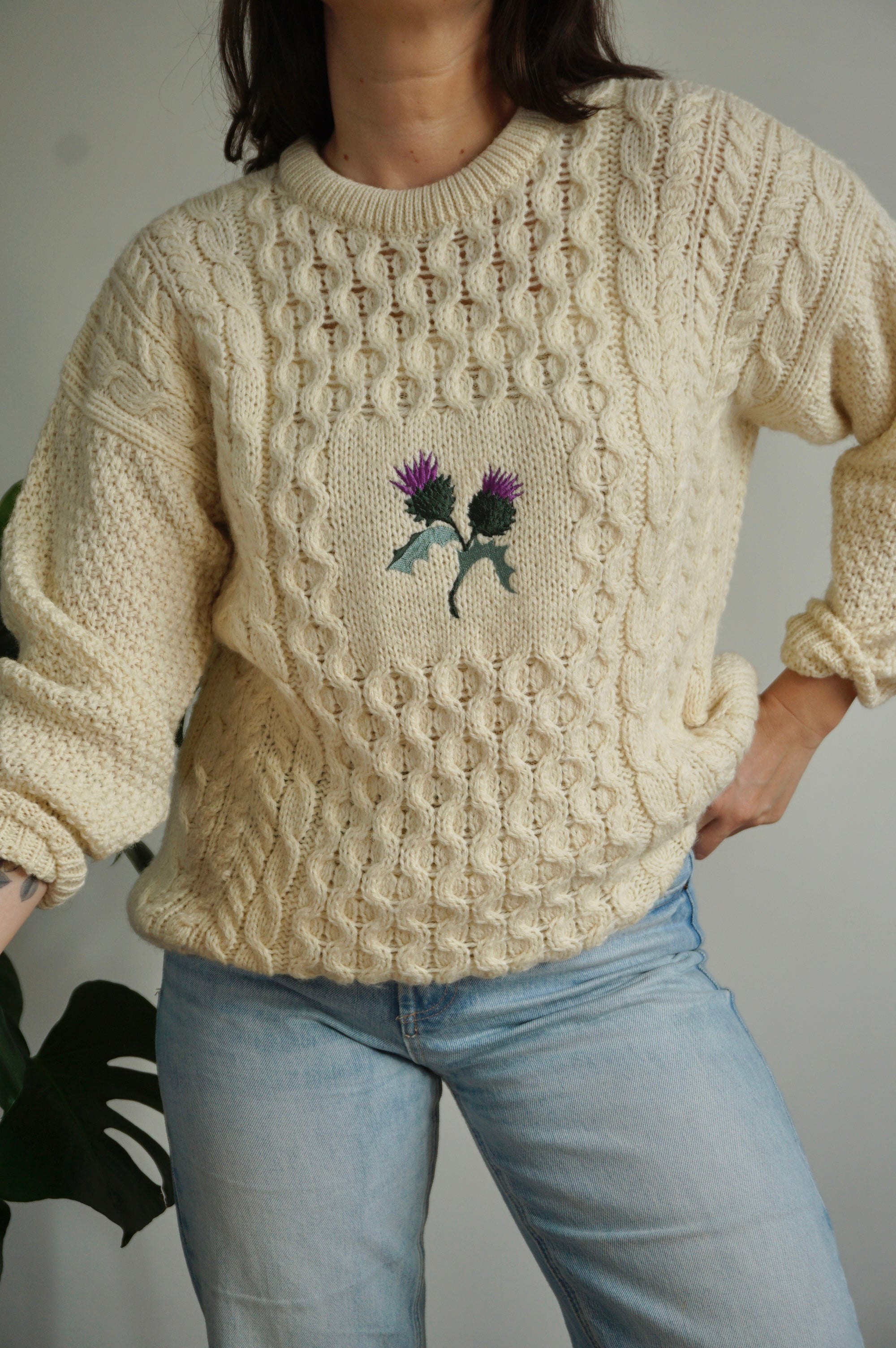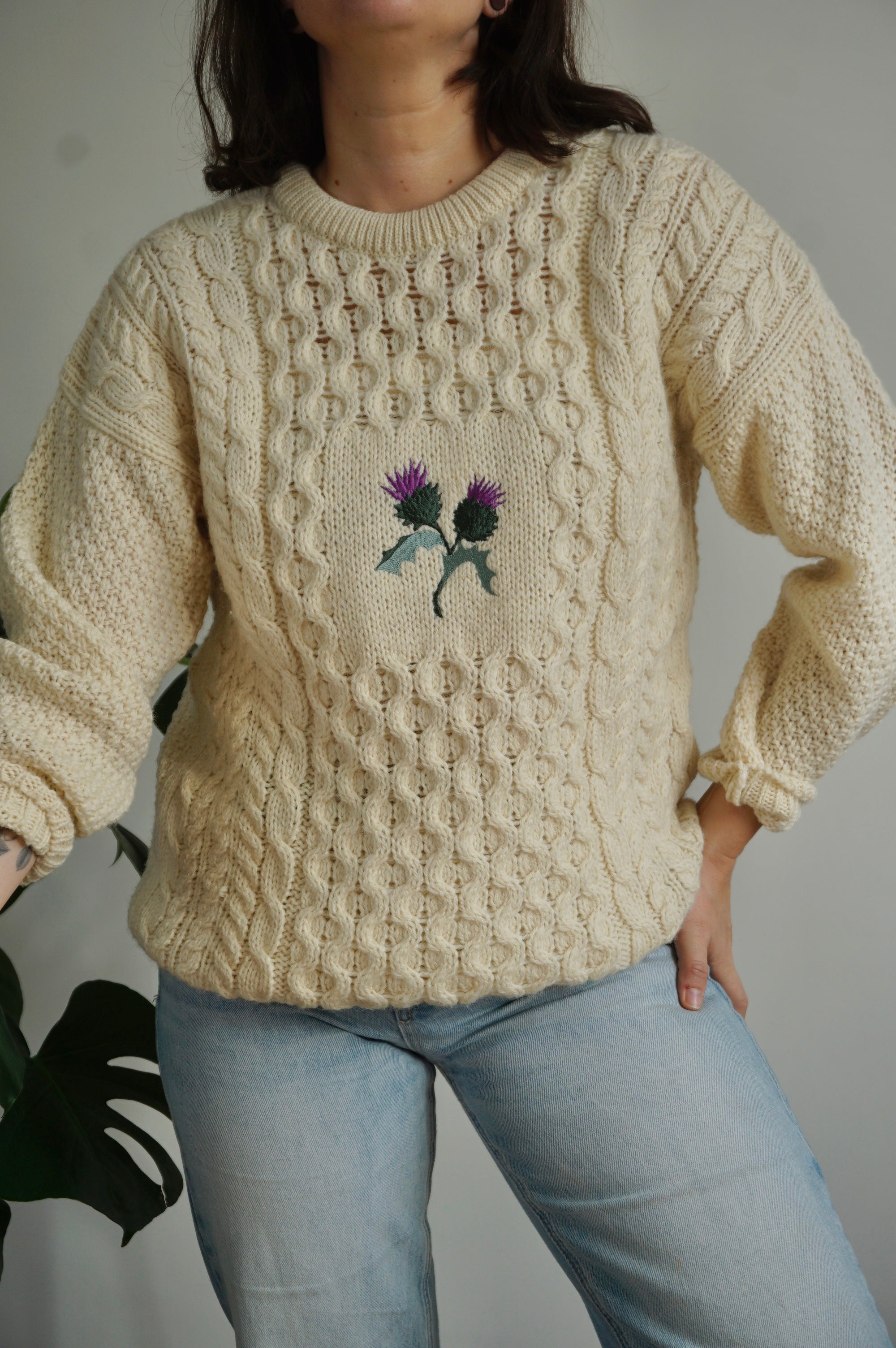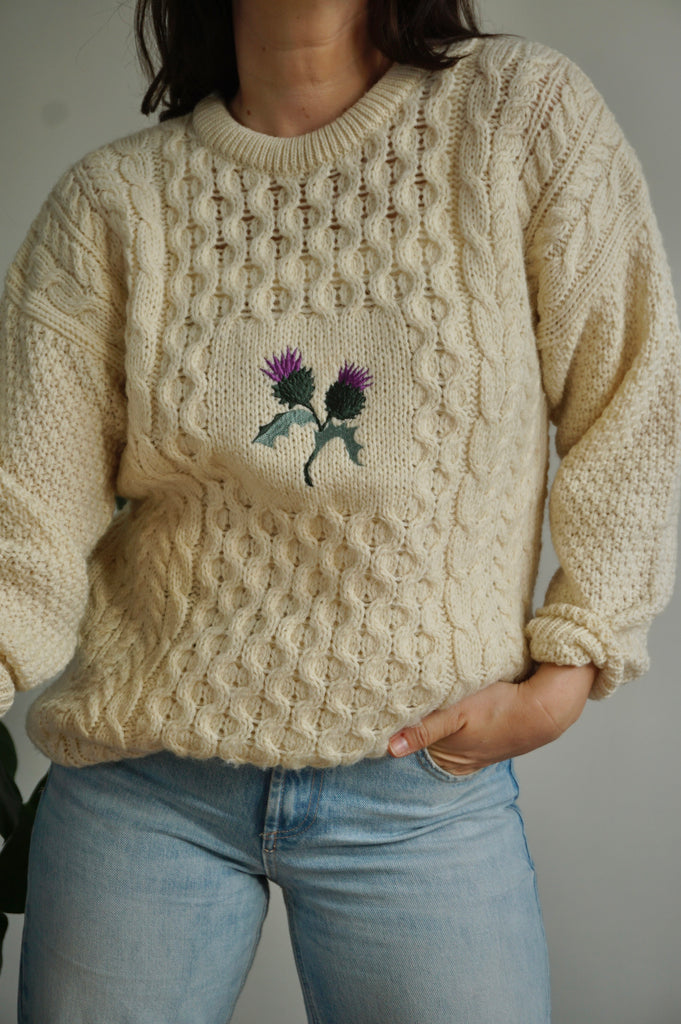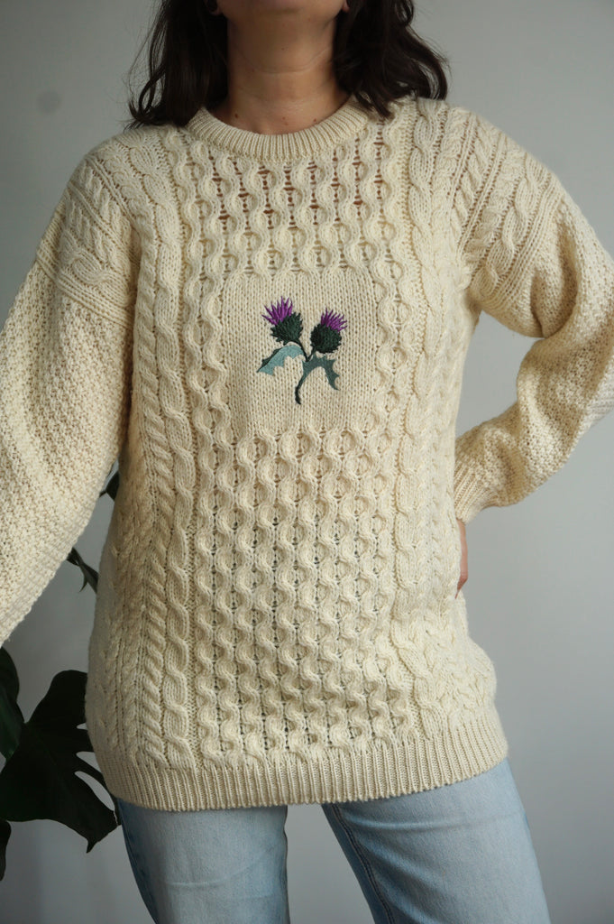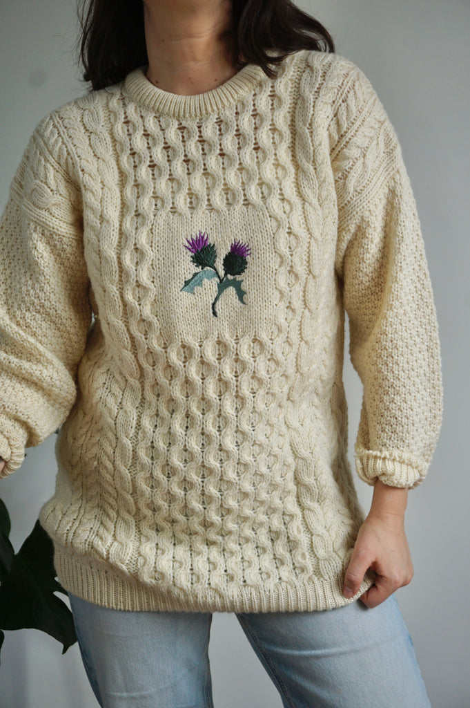 Thistle Flower - Vintage Embroidered Aran Sweater - Wool - M/L