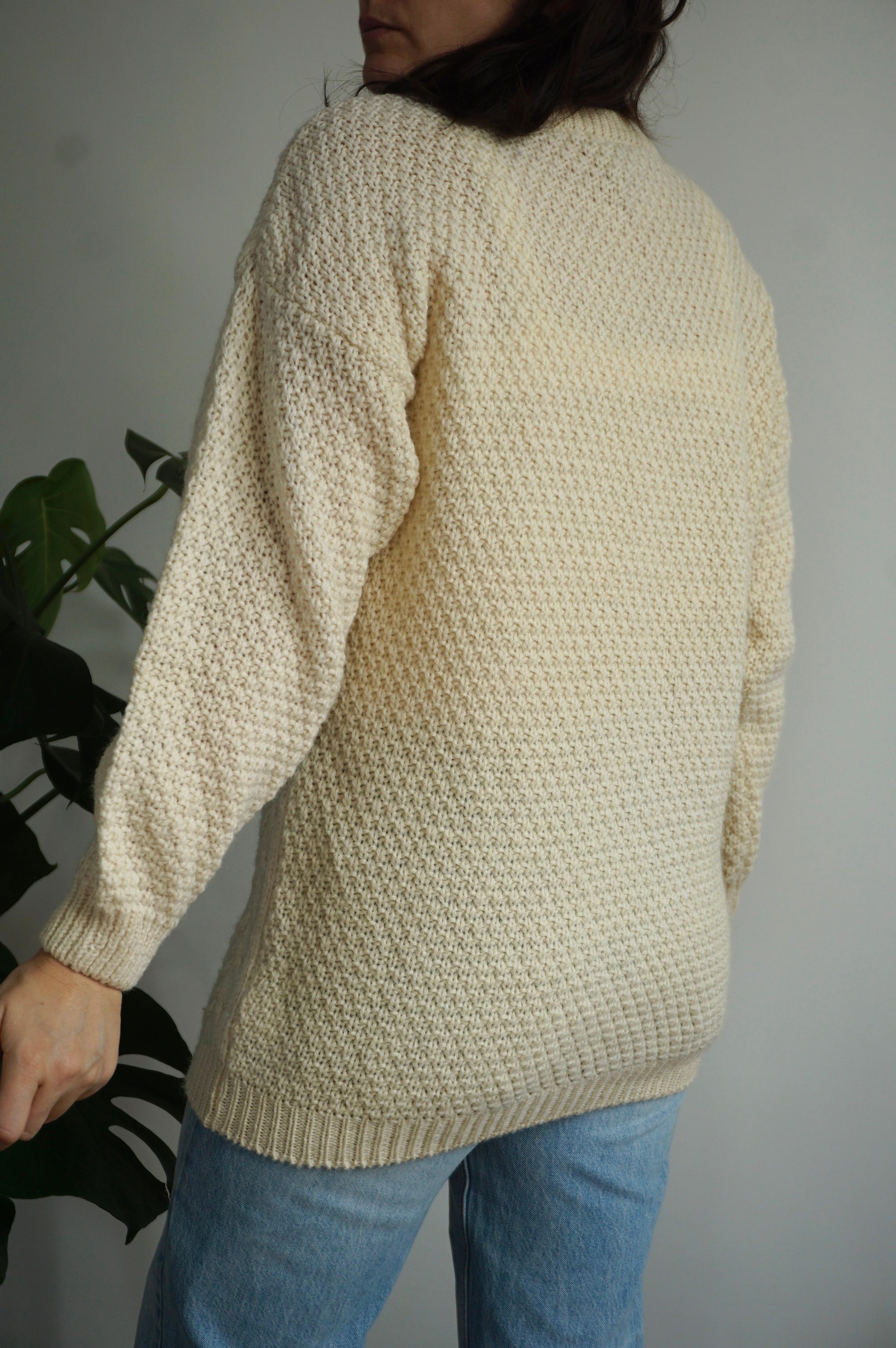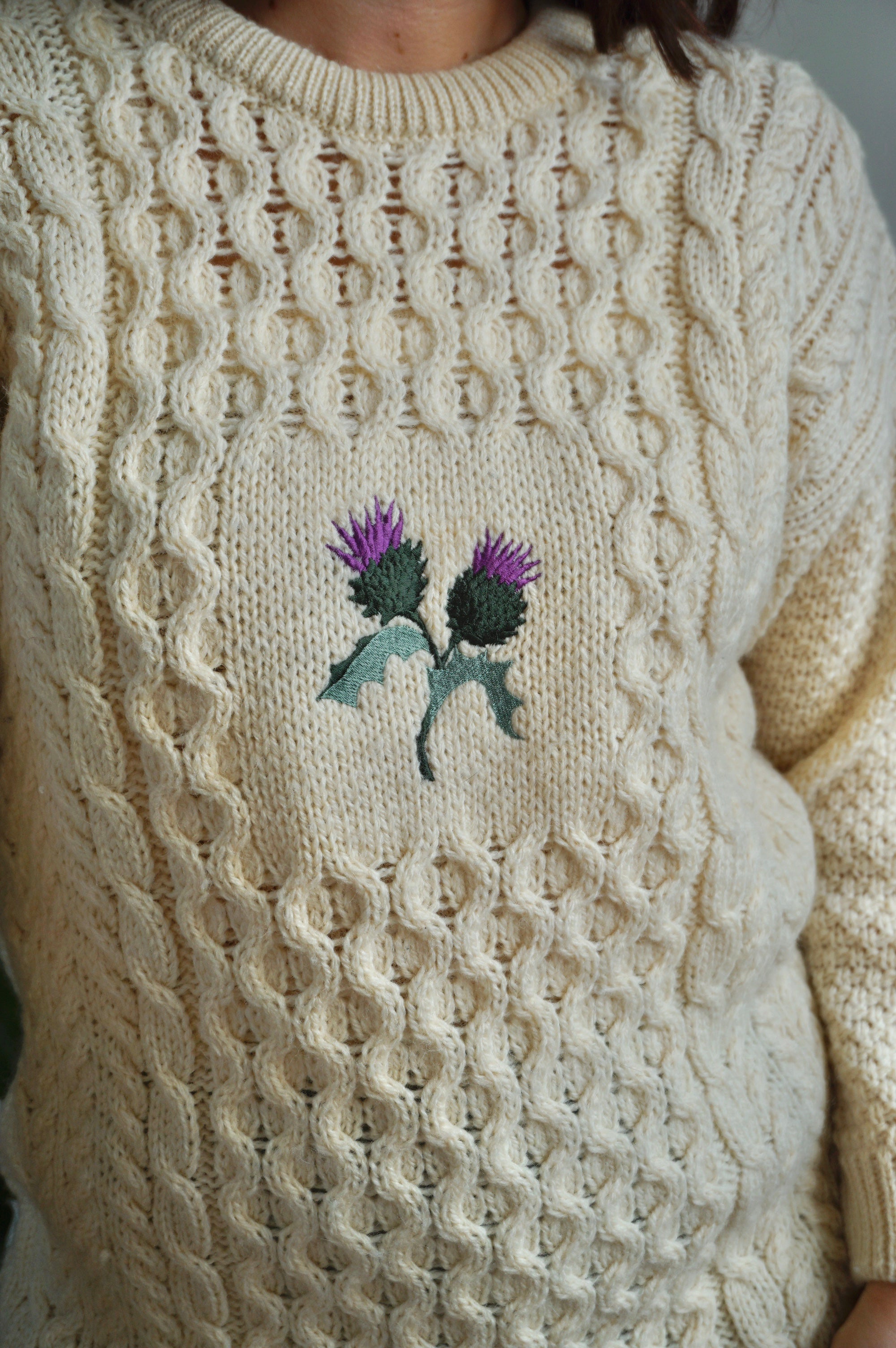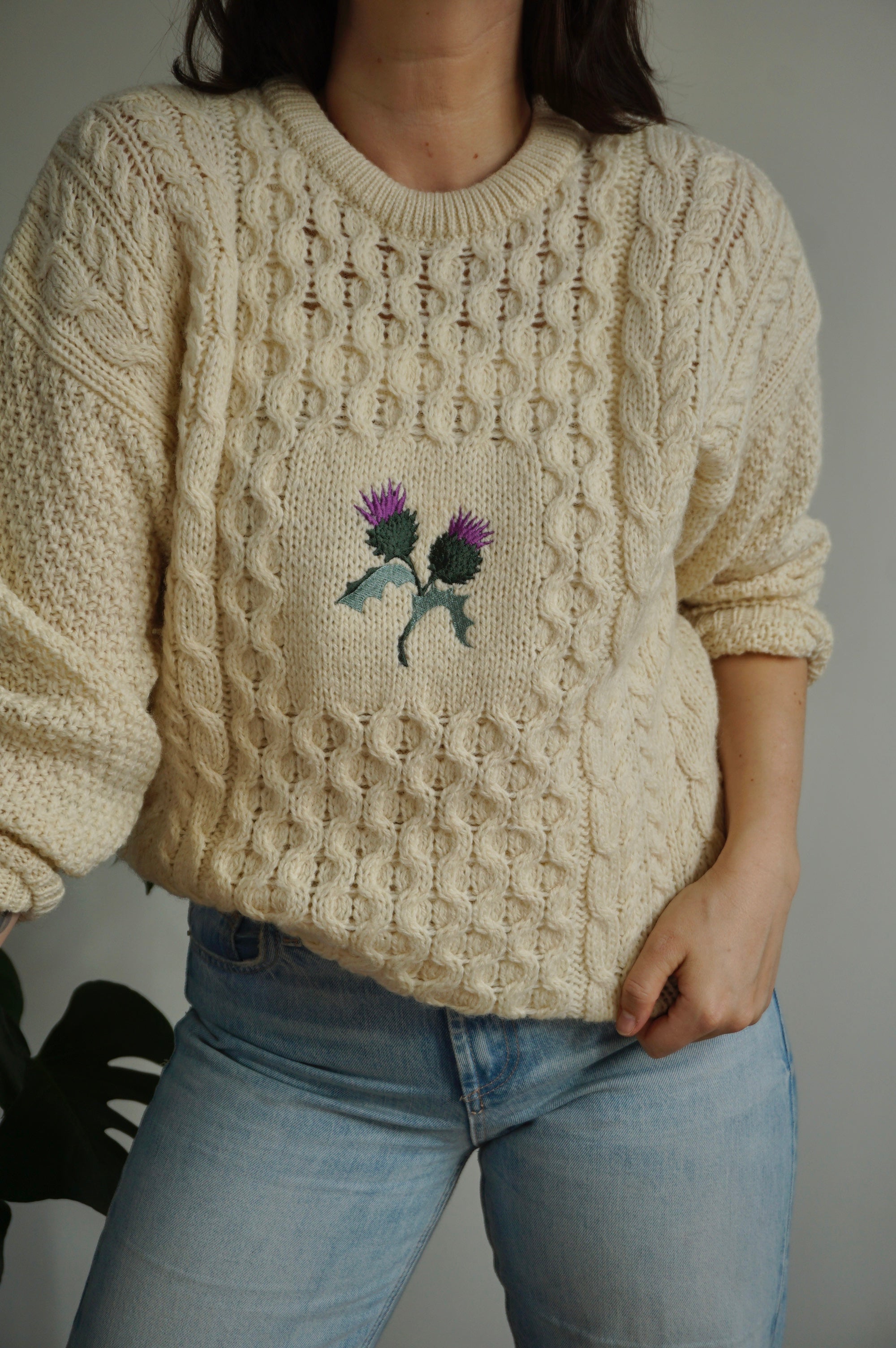 Thistle Flower - Vintage Embroidered Aran Sweater - Wool - M/L