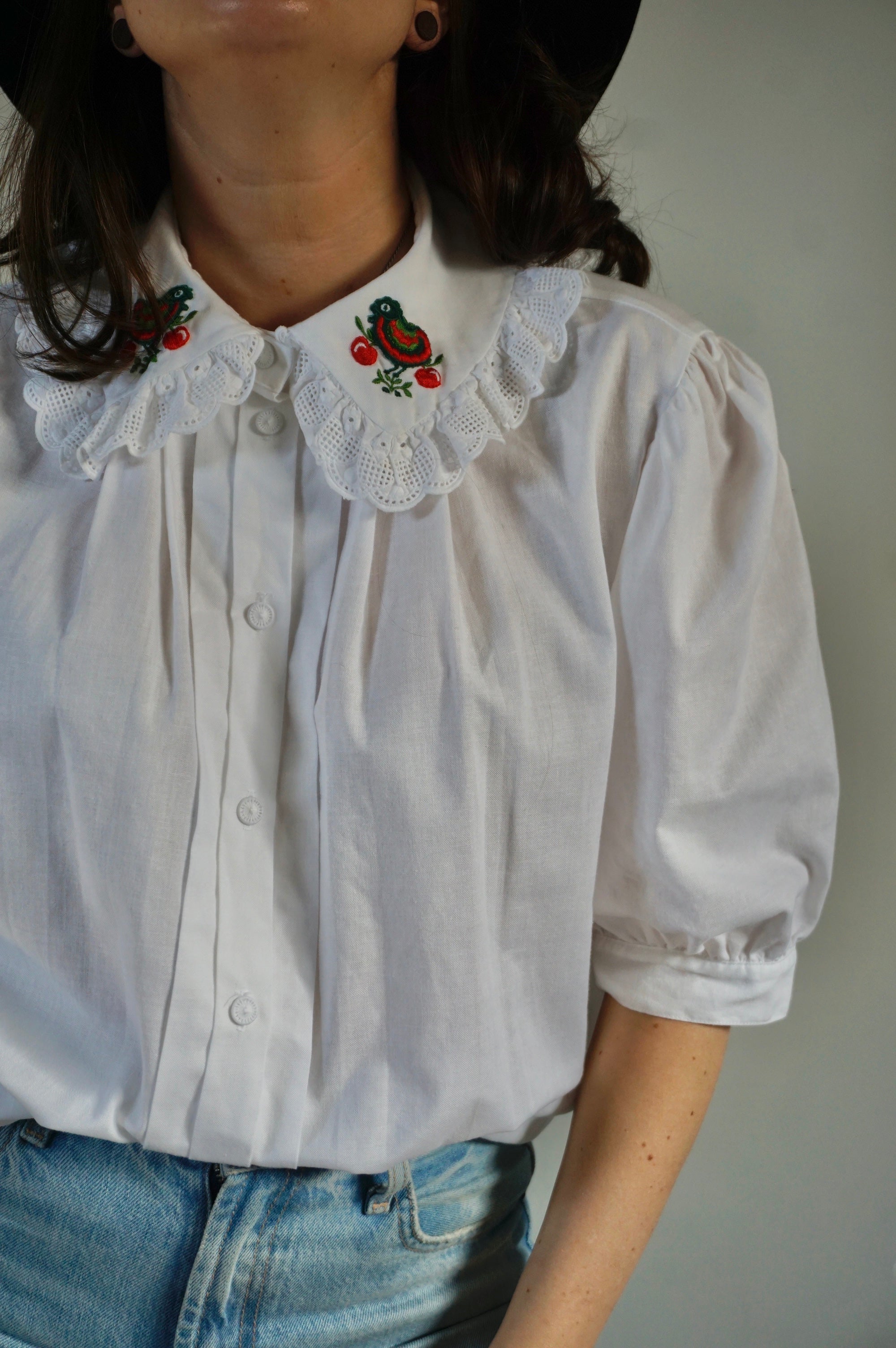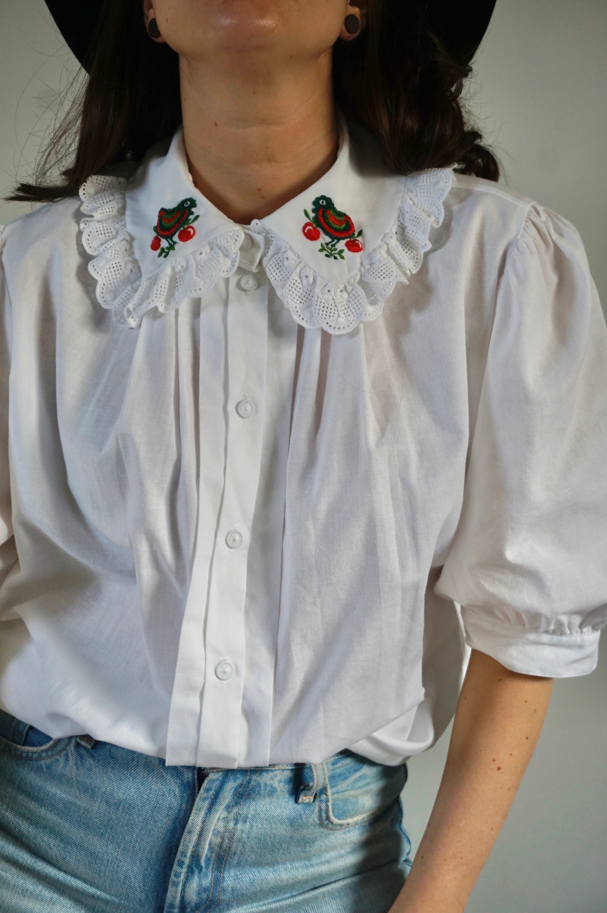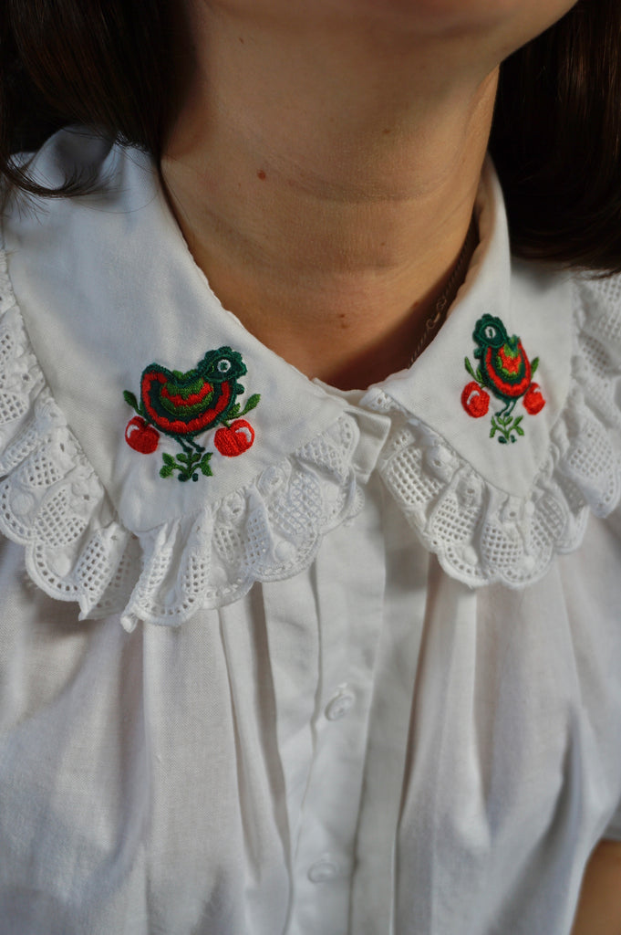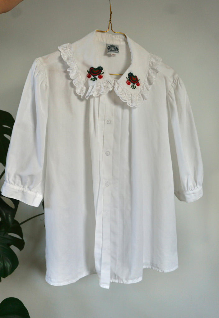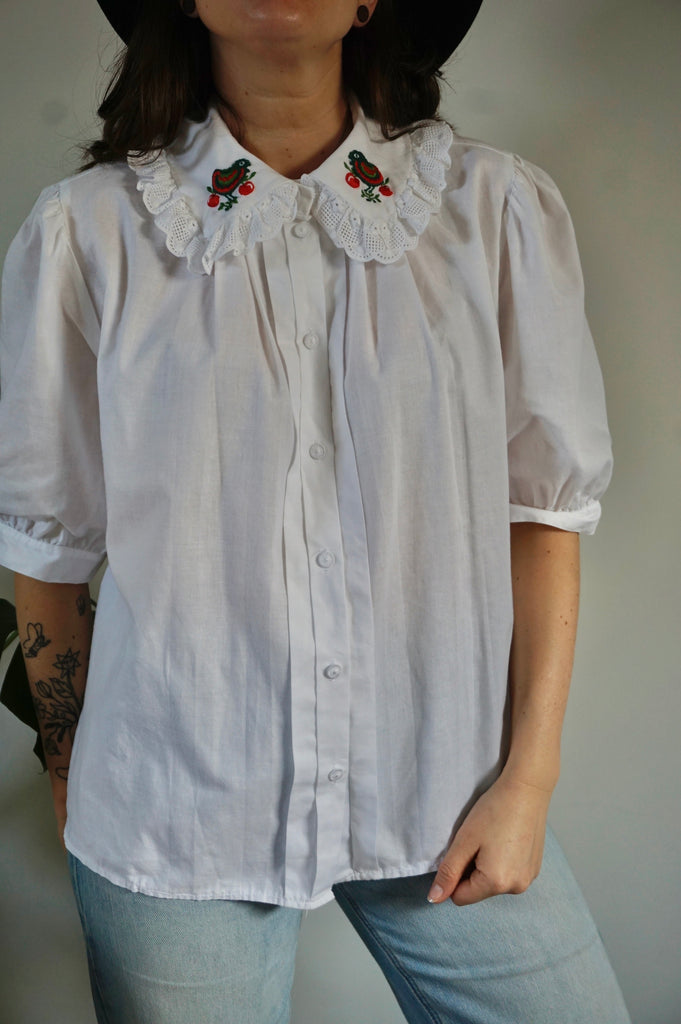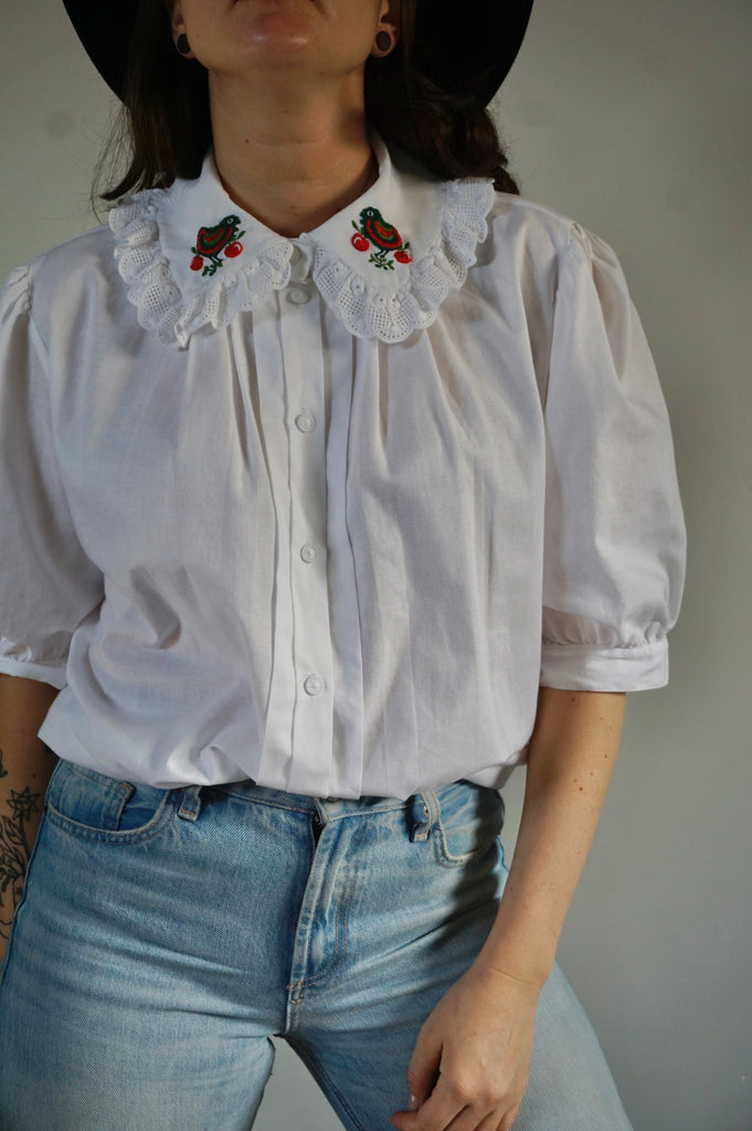 Birds and the Cherries - Vintage Blouse - Lace and Embroidered details - L