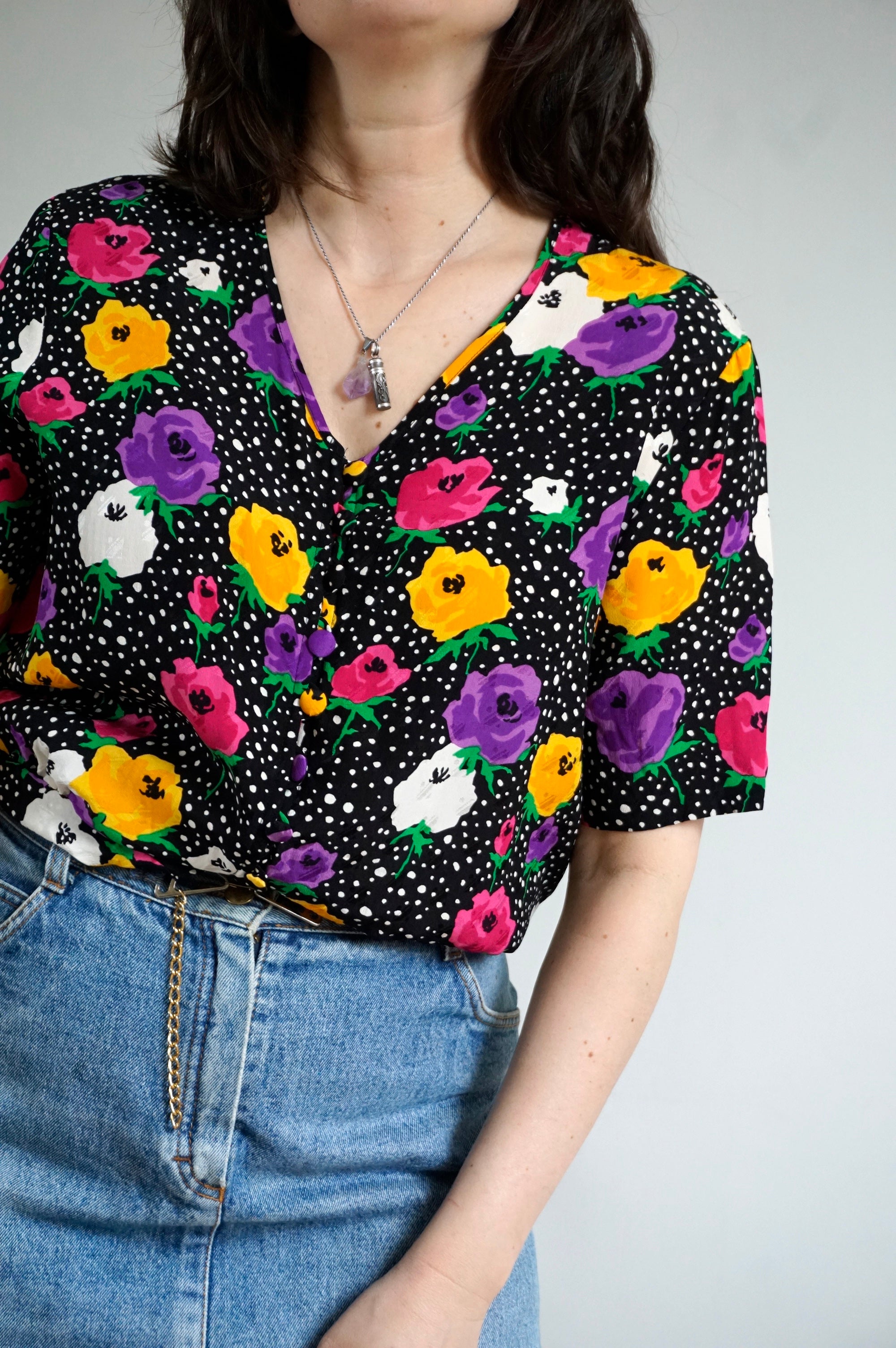 Flowers at Night - Vintage 100% Silk Blouse - S/M