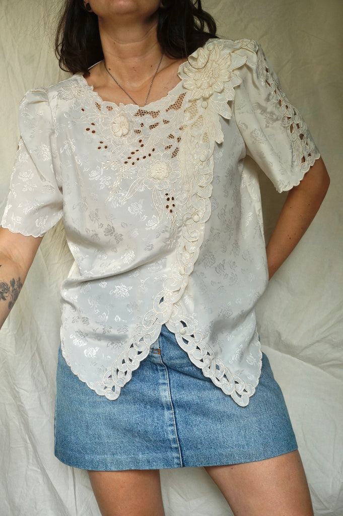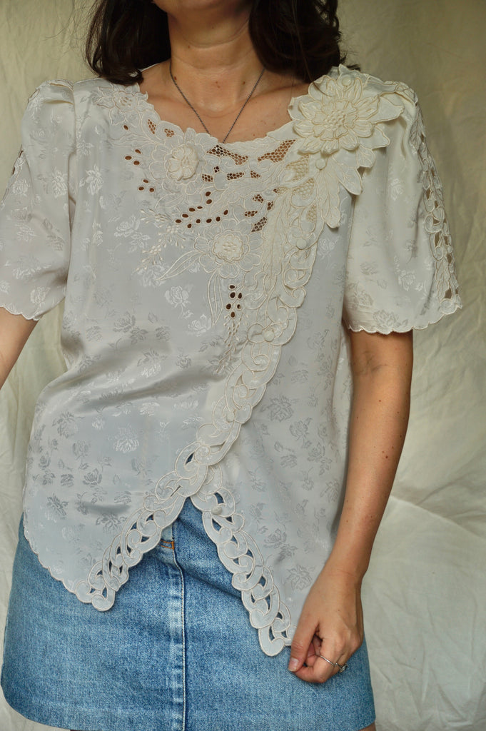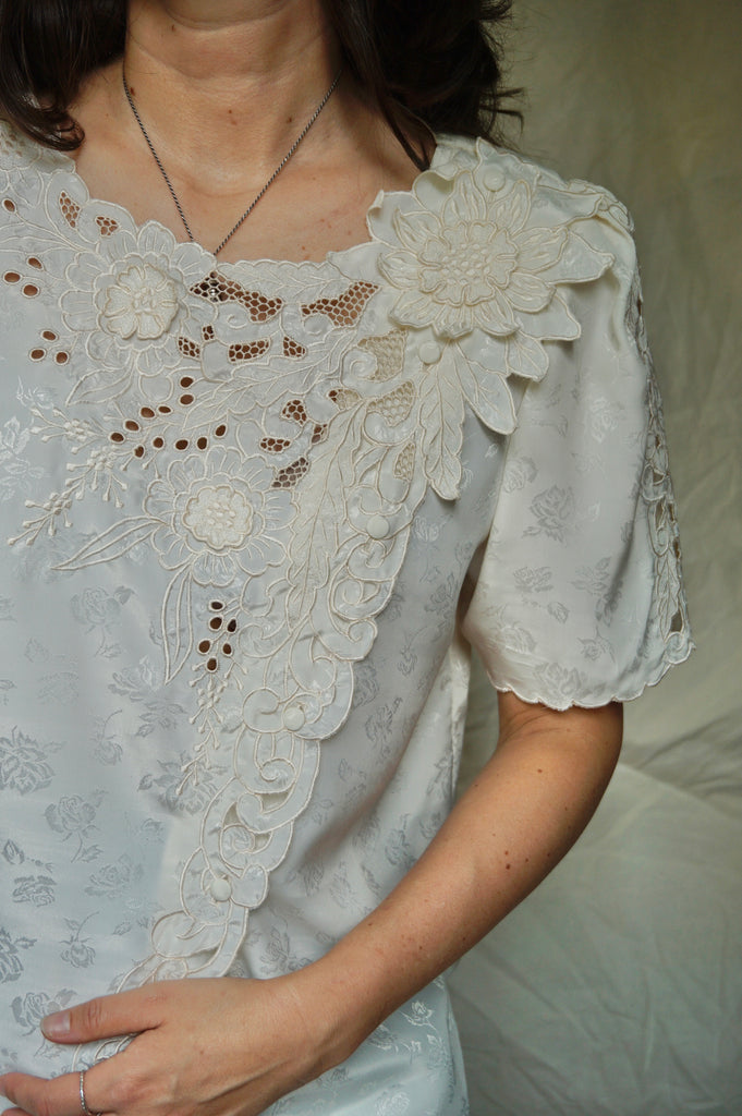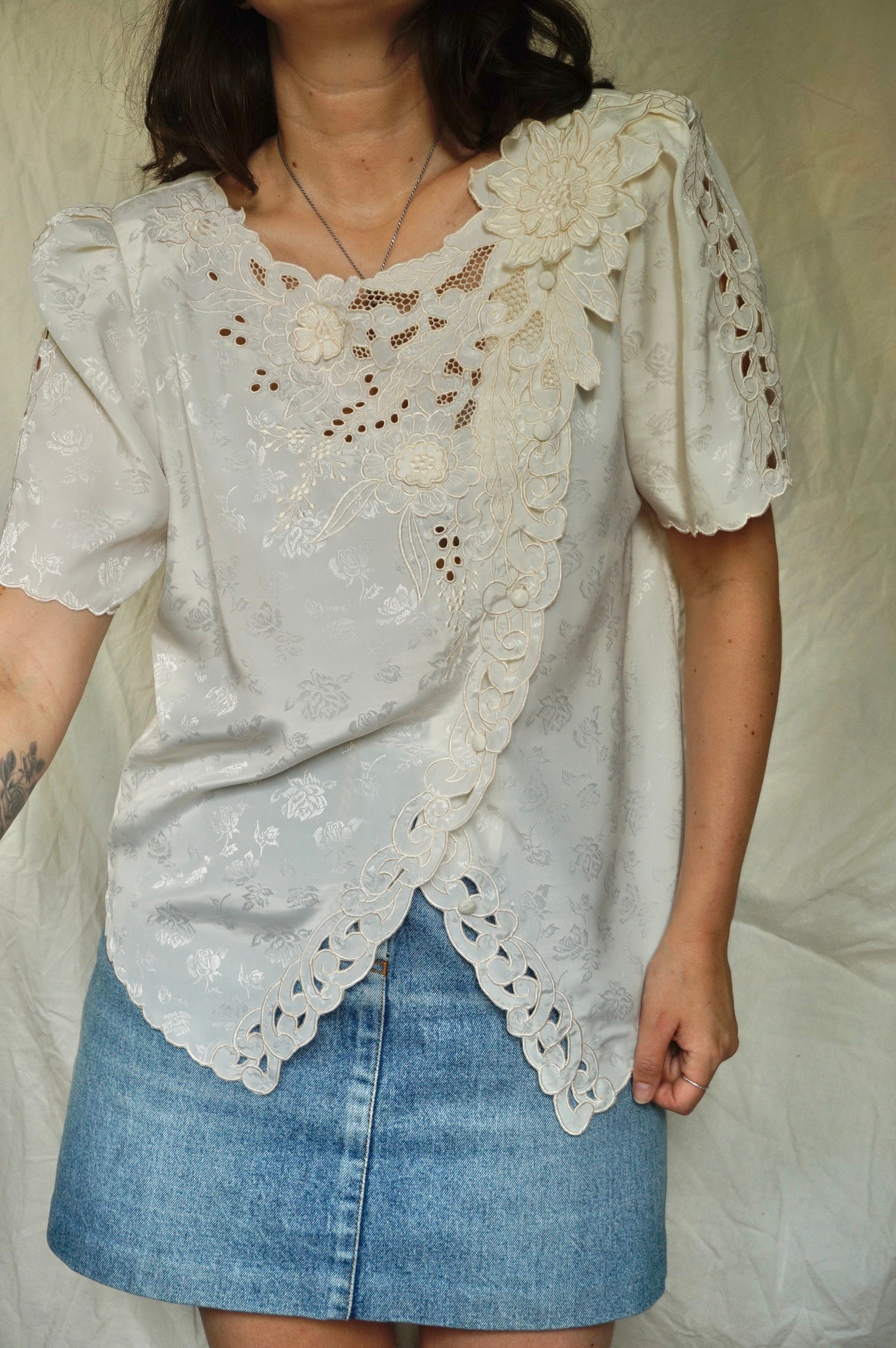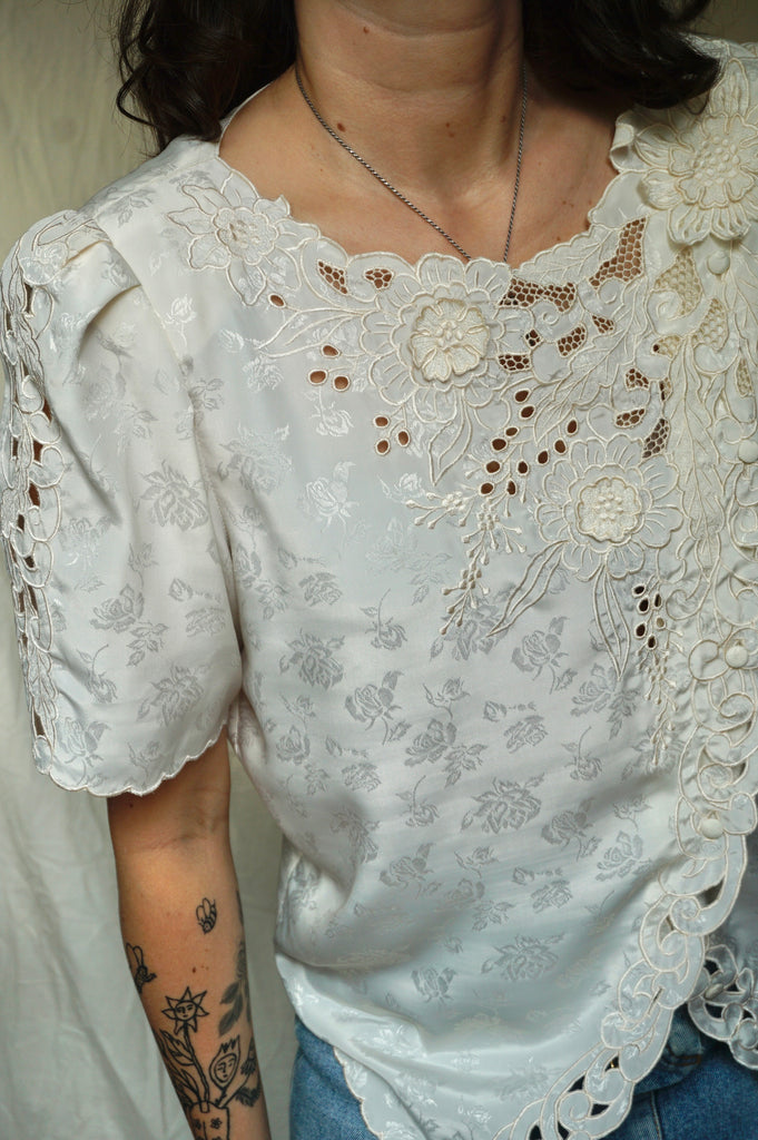 The Holy Grail - Vintage Blouse - Embroidered & Lace Details - L