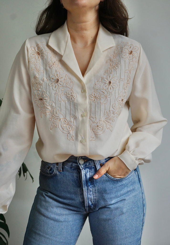 Beige Daisies - Vintage Blouse - Embroidered details - M/L