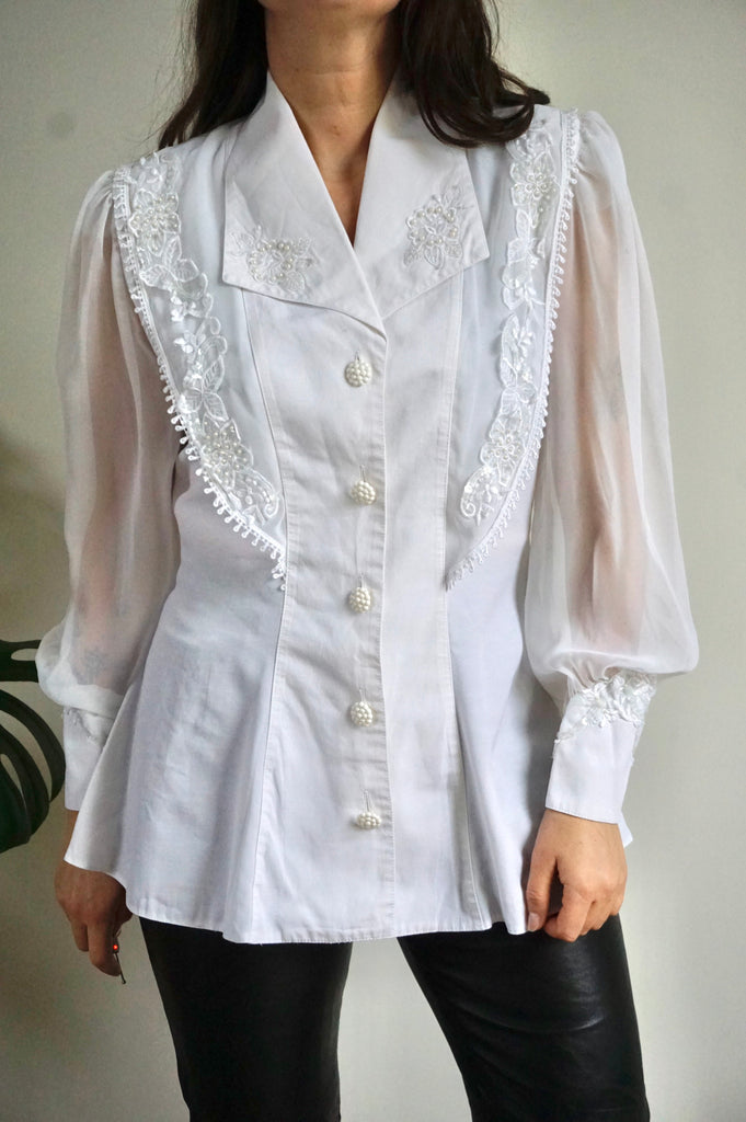 Blue Tulips - Vintage Blouse - Lace Details - L