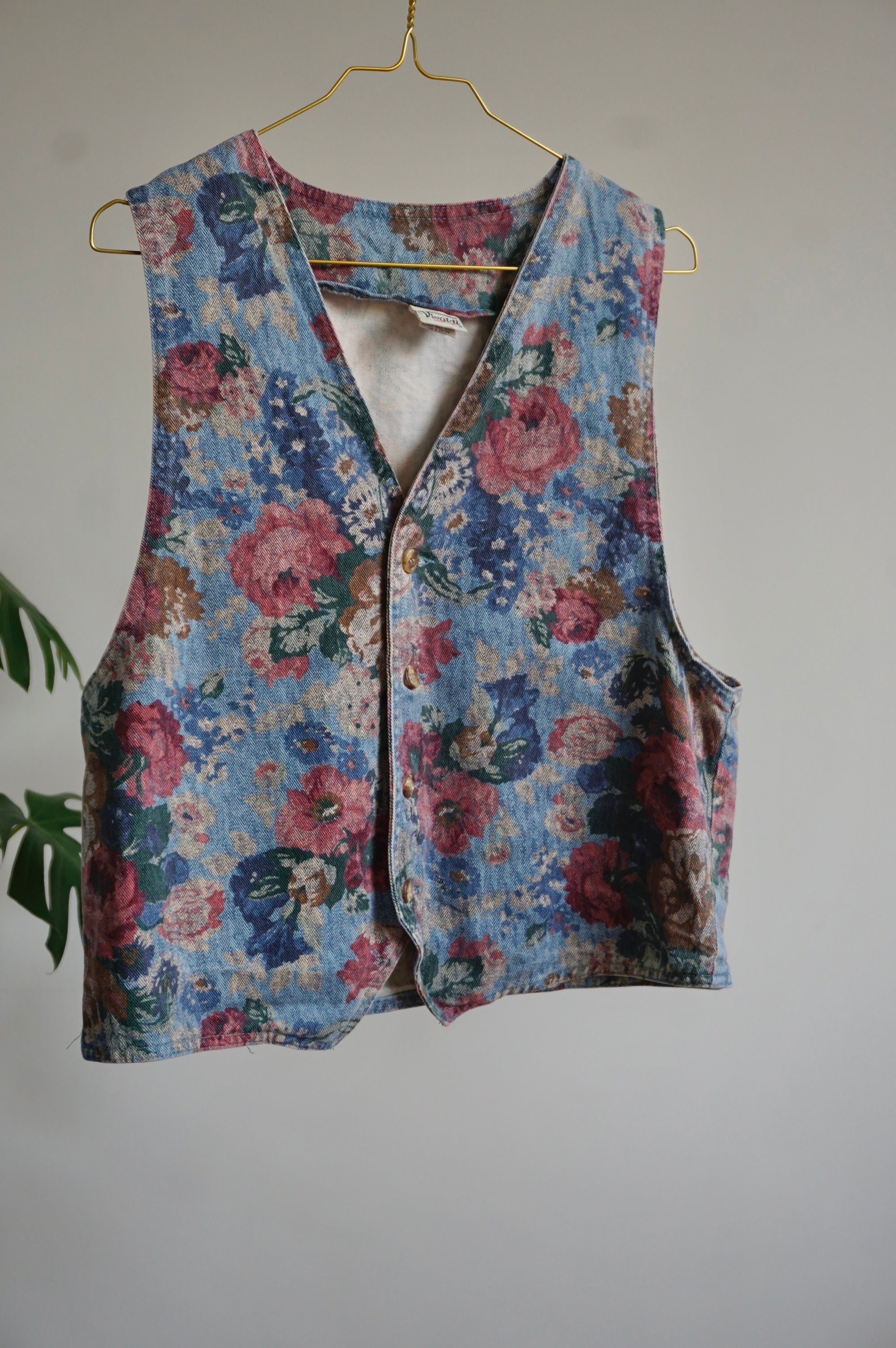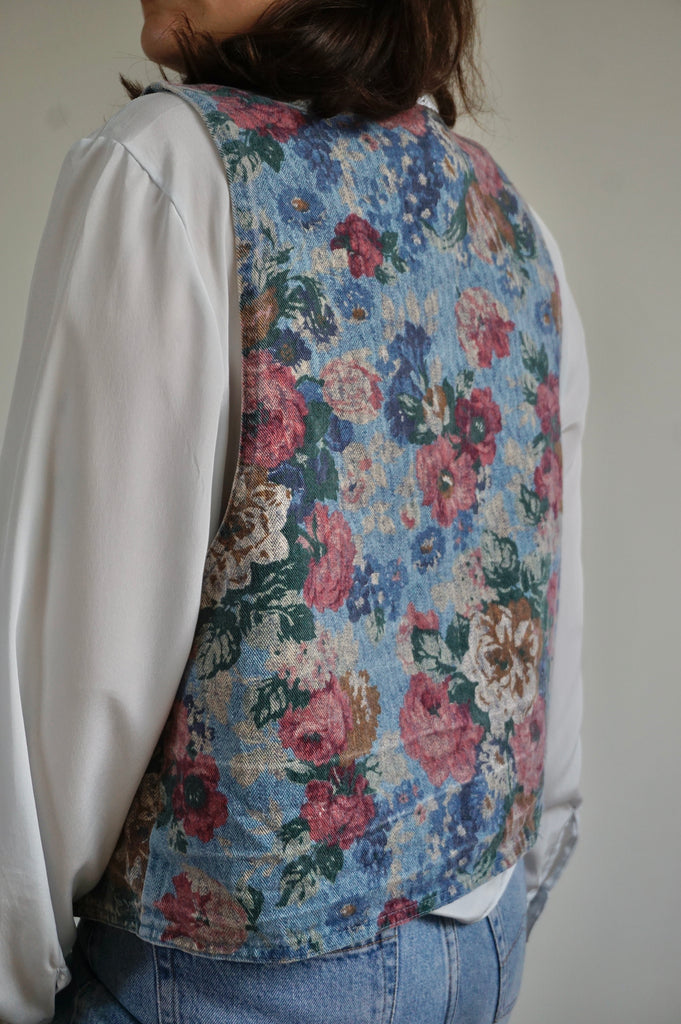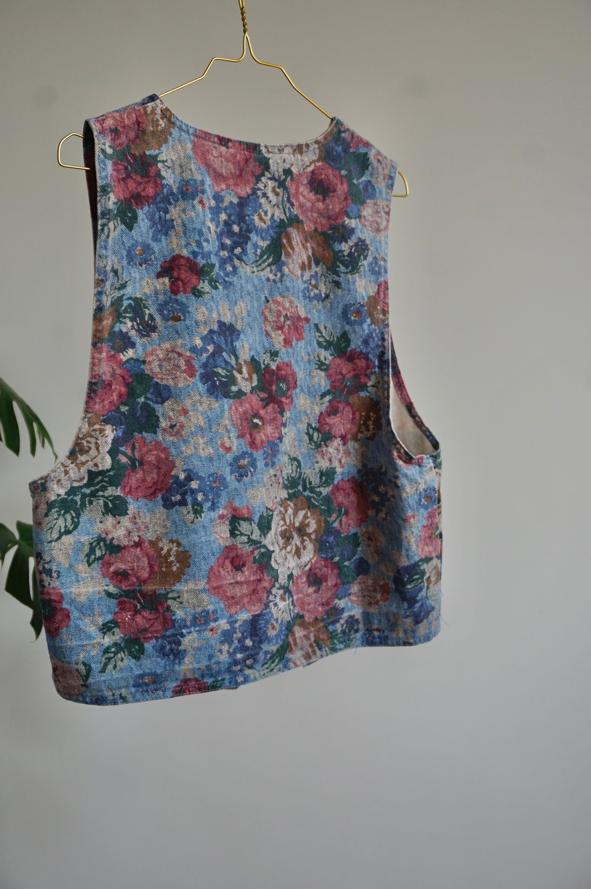Flower Clouds - Vintage Denim Gilet - Flower print - L