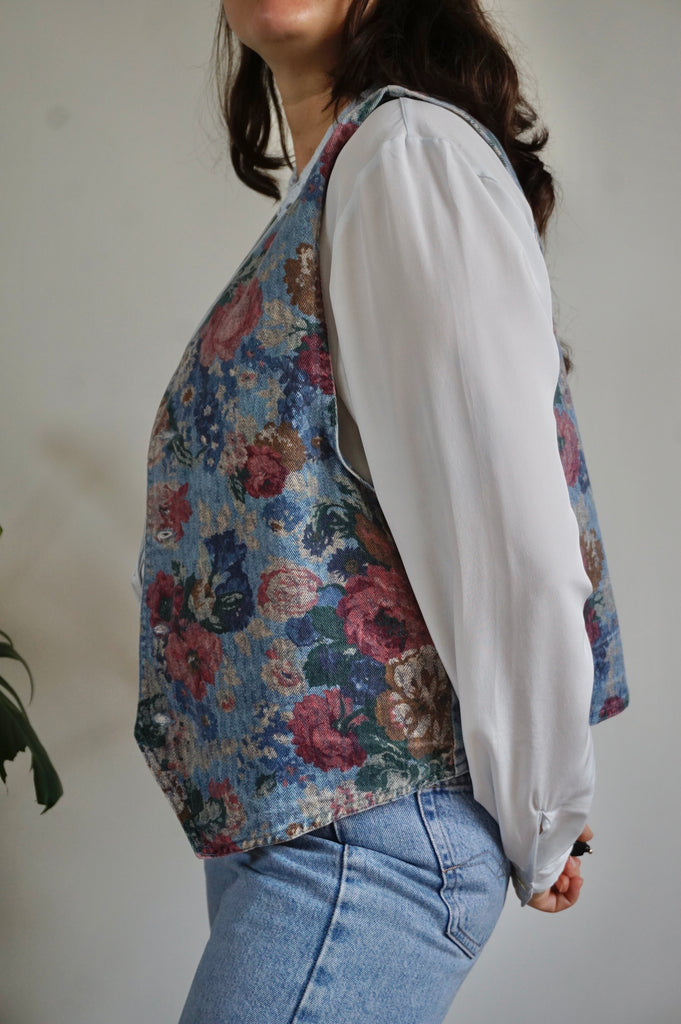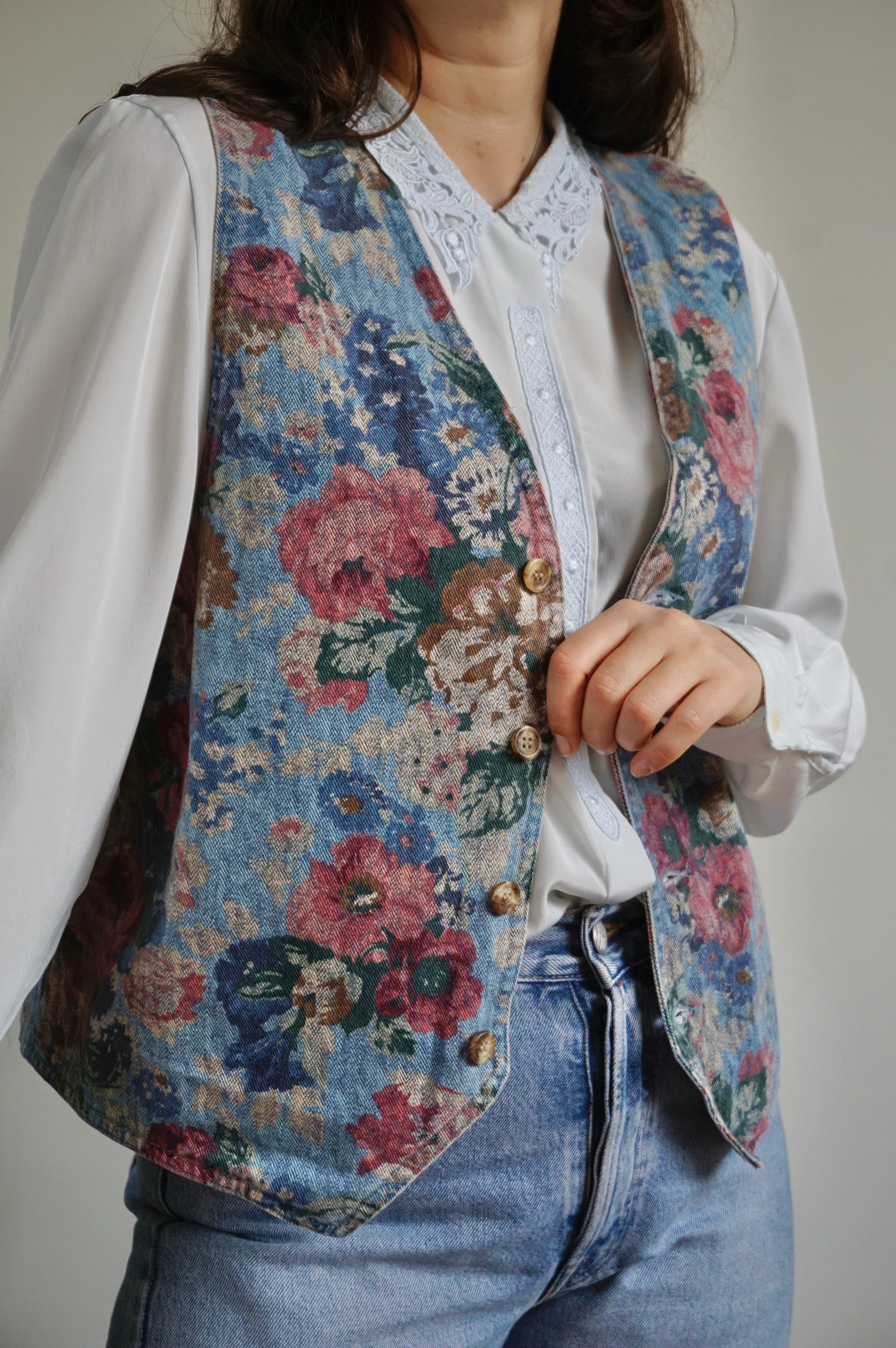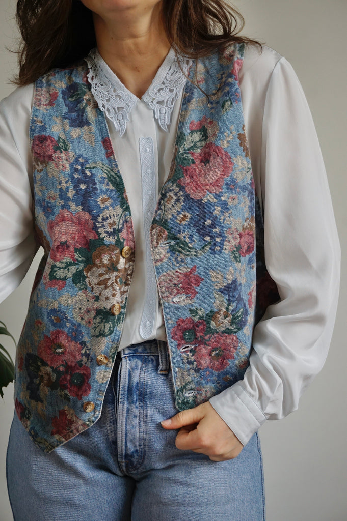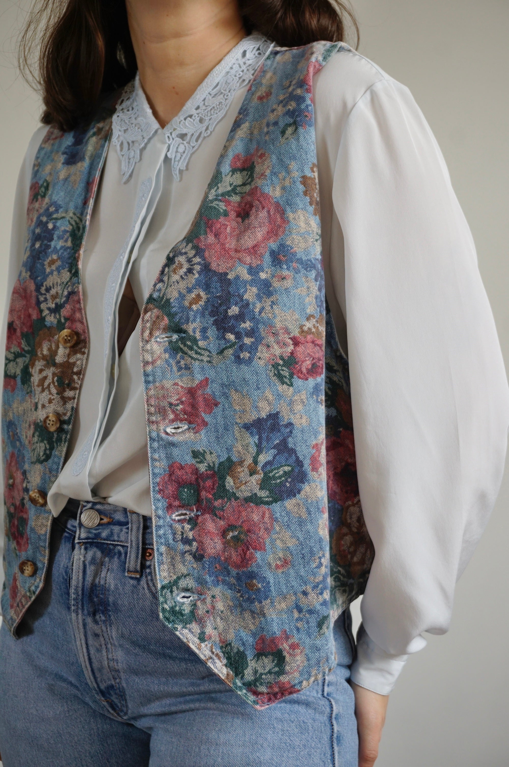 Flower Clouds - Vintage Denim Gilet - Flower print - L